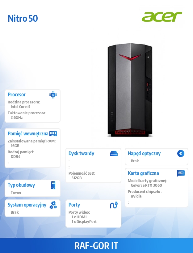 Wykonany z czarnego metalu z ognistymi akcentami komputer Nitro 50 ma wszystko, czego potrzebujesz do grania w doskonałym klatkażu i bez opóźnień. Dzięki mocy najnowszego procesora Intel Core i7 jedenastej generacji i karty graficznej GeForce RTX z serii 301 możesz bez zastanowienia ustawić jakość grafiki na poziomie ultra.